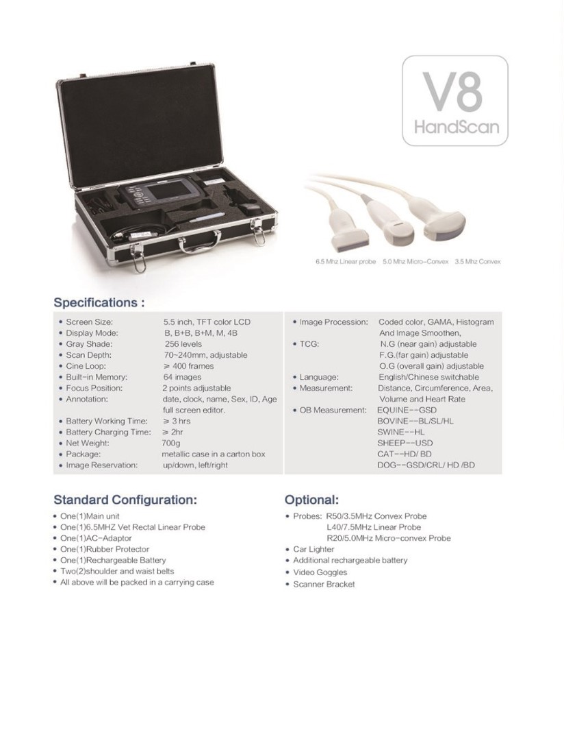 Versatilidad de Sondas: Viene con la sonda rectal de 6.5MHz (bovinos/equinos) pero que es un equipo que "crece" con el profesional, ya que puede adaptarle sondas convexas o micro-convexas después.